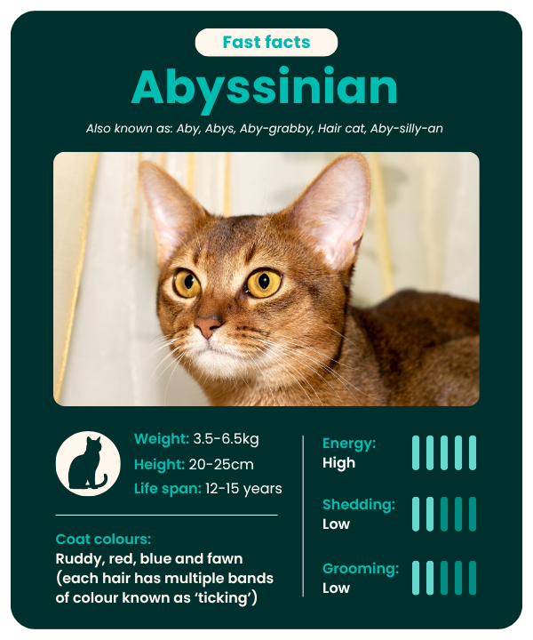 Abyssinians are naturally clean and low-shedding. All their slinky coat needs is a weekly brush.